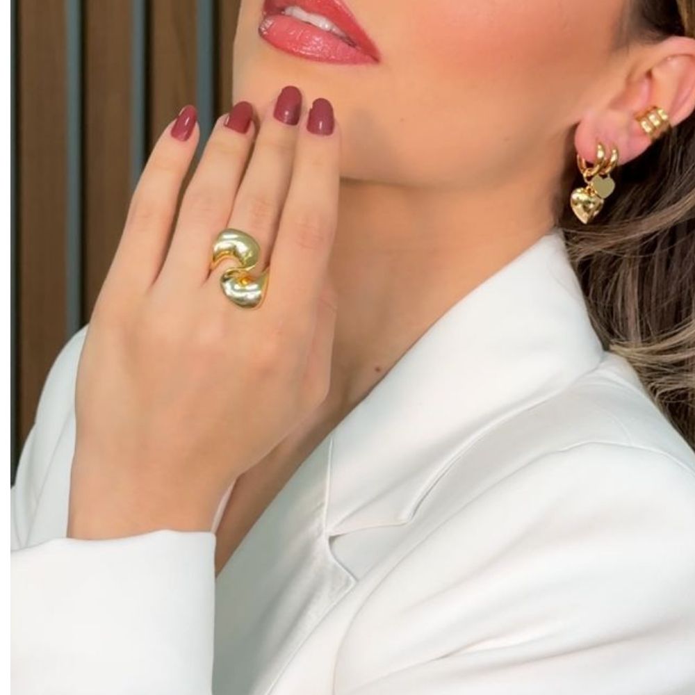 O anel Vitória possui um design fluido e contemporâneo, perfeito para mulheres que desejam expressar elegância com um toque de ousadia. Com acabamento dourado polido, ele possui um formato curvado que remete a formas orgânicas e suaves, transmitindo movimento e sofisticação.
