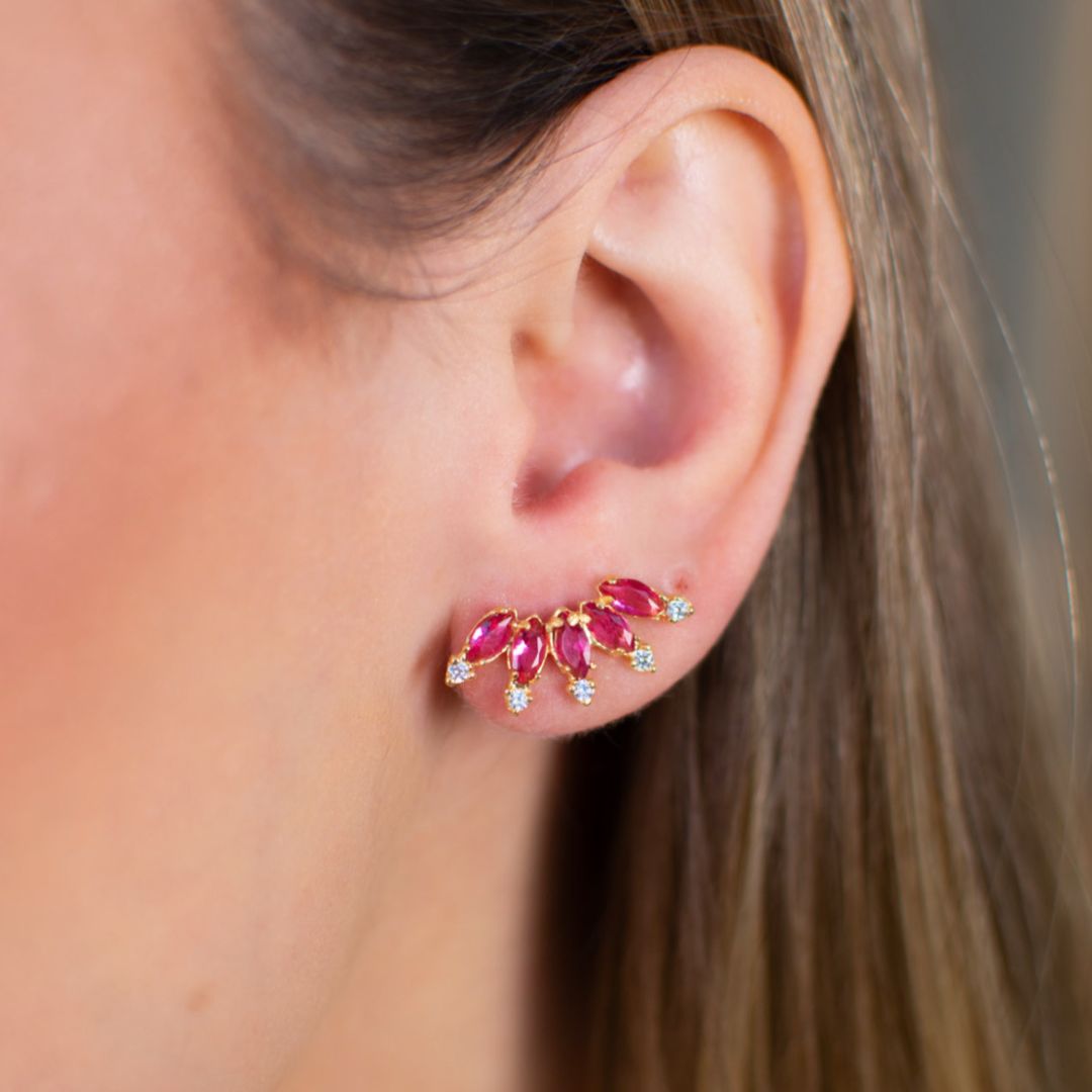 Brinco navetes rubi em banho de ouro 18k, peça atemporal, com cara de joia de grandes joalherias, leve e muito confortável. Ideal para mulheres chiques e contemporâneas. A combinação perfeita para diversos looks.
